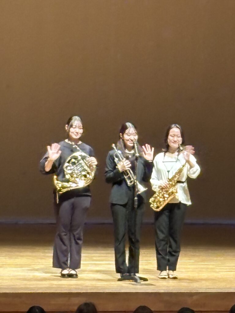 “学習ウェアdeファッションショー”でスタート。音楽学科は、トランペット、サックス、ホルンの管楽器を持った3人の学生が、試験などで演奏する服装で、登場しました。