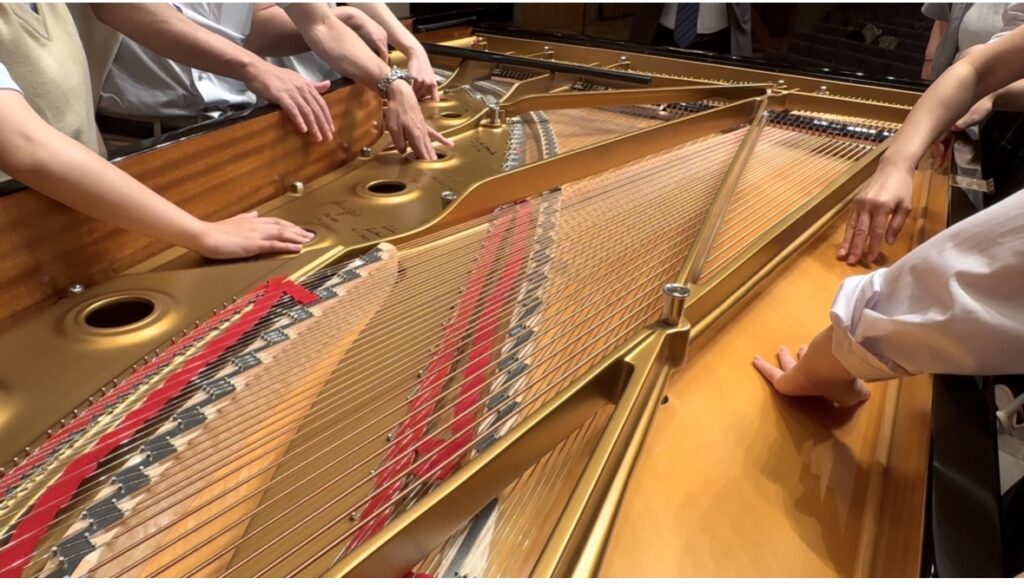 まず、ピアノの響板を触り、演奏した時の振動を感じてみます。