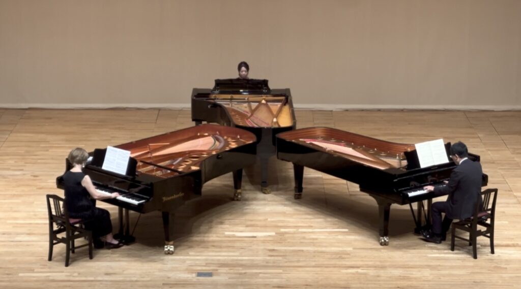 森島英子先生、菅野雅紀先生、大野真由子先生が、三方向に光を放つかのごとく向かい合い、演奏します。音の柱が生まれるようで、圧巻です!