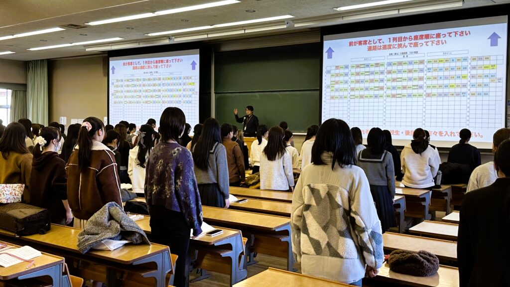 14:45、 「聖徳学園 “第九” 合唱団」を構成する音楽学部生、高校生、卒業生、後援会の方々が次々と大教室に集まりました。いつものように、合唱指導の春日保人先生、ピアノの辻田祐希先生のもとで発声練習です。