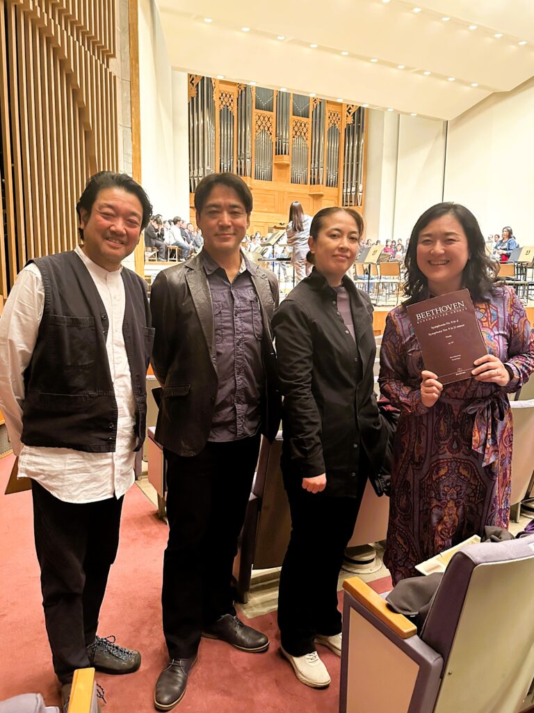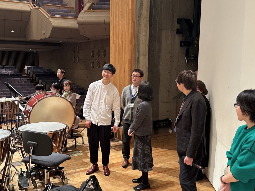 第4 楽章のリハーサル前に舞台の袖で談笑するのは、今回の指揮者である北川森央先生と、以前は東京交響楽団に首席ホルン奏者として在籍されていた大野雄太先生です。
