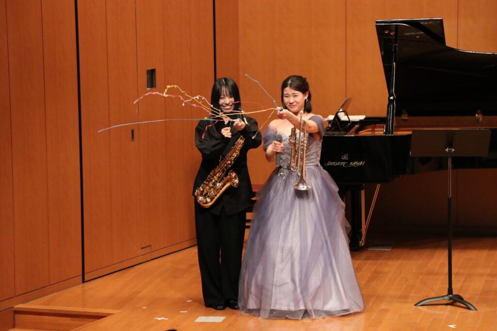 後半は学部生6名によるアンサンブルでスタート。ひと口に「サックス」と言っても、音域によってソプラノからバスまで様々な形状がありますが、同じ楽器に統一された澄んだ音色は気持ちよく響きます。《ガラスの香り》は乗りの良いジャズ風の部分もあり、息の合ったアンサンブルは、お客様からも「カッコいい」と大好評。