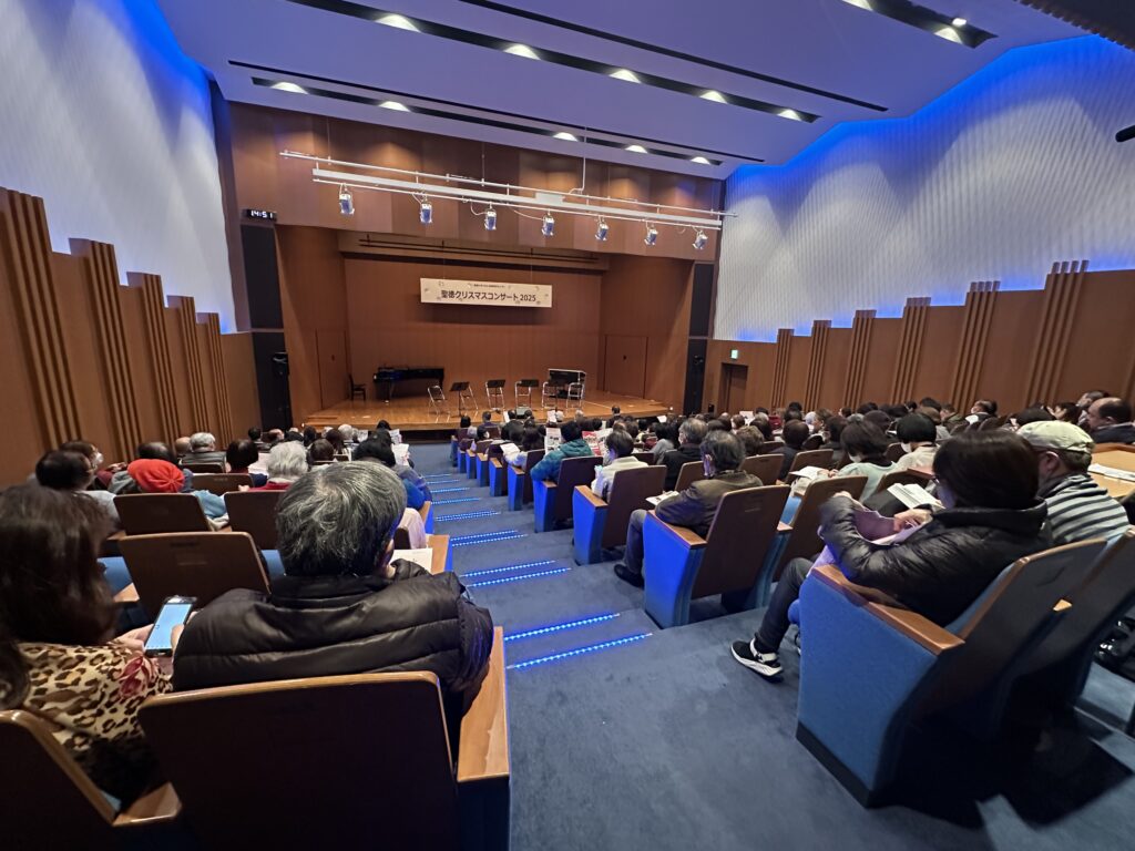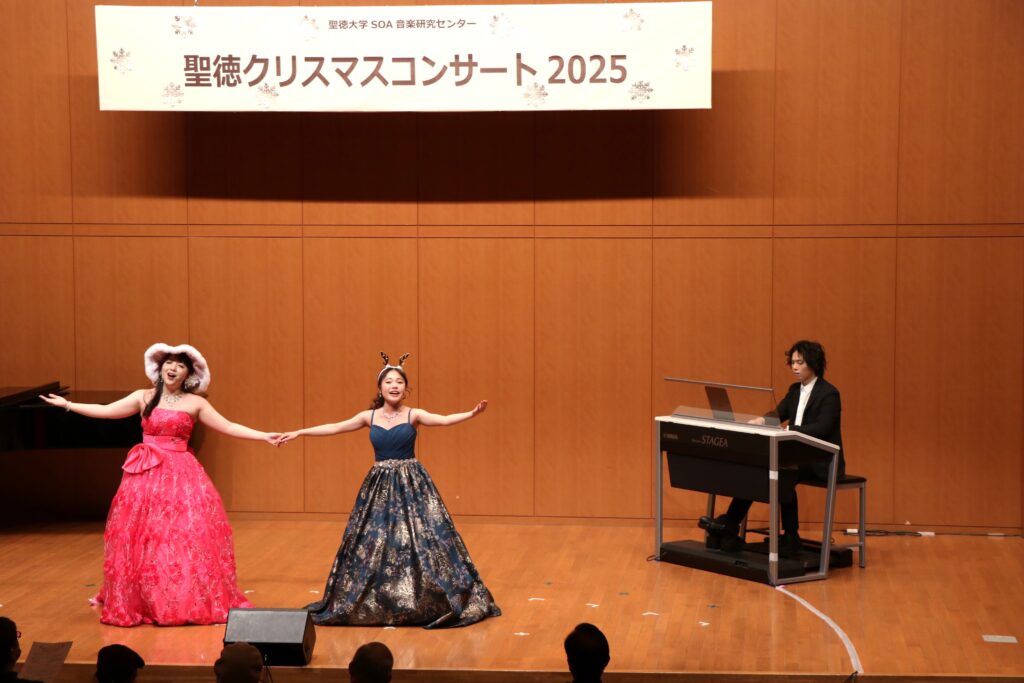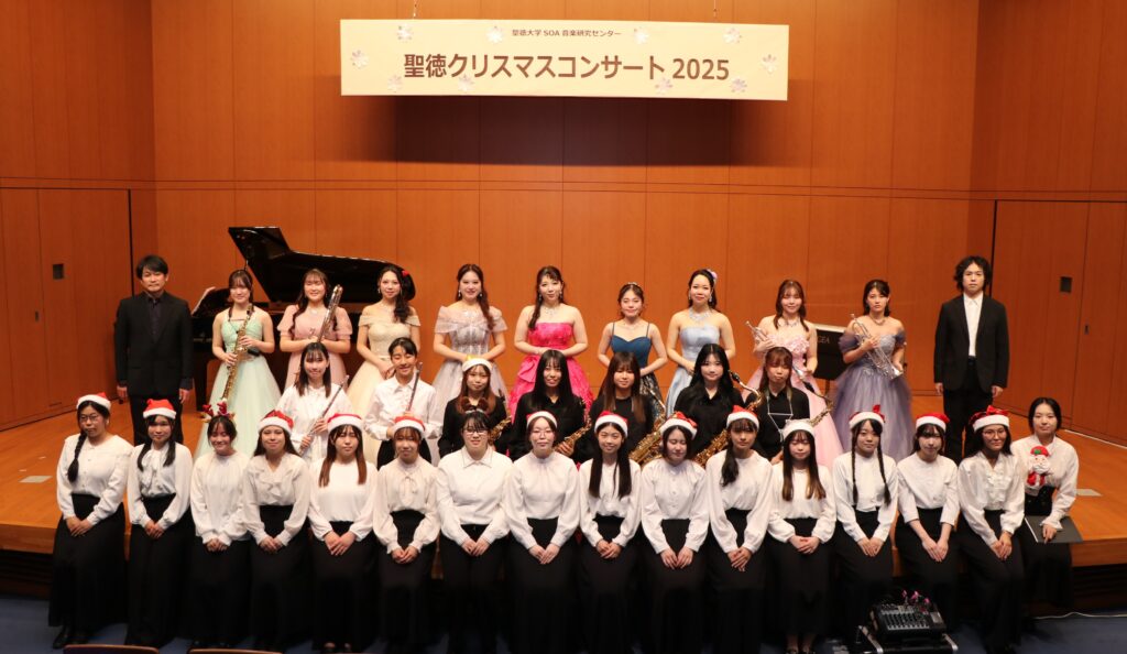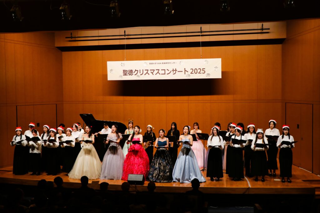 2012年に始まった「松戸クリスマス音楽祭」には音楽学部の学生・卒業生・教員も例年多数参加しています。その一環として、今年も12月20日、「聖徳クリスマスコンサート2025」が香順メディアホールで開催されました(主催:聖徳大学SOA音楽研究センター)。ホールはぎっしり満員のお客様です。
