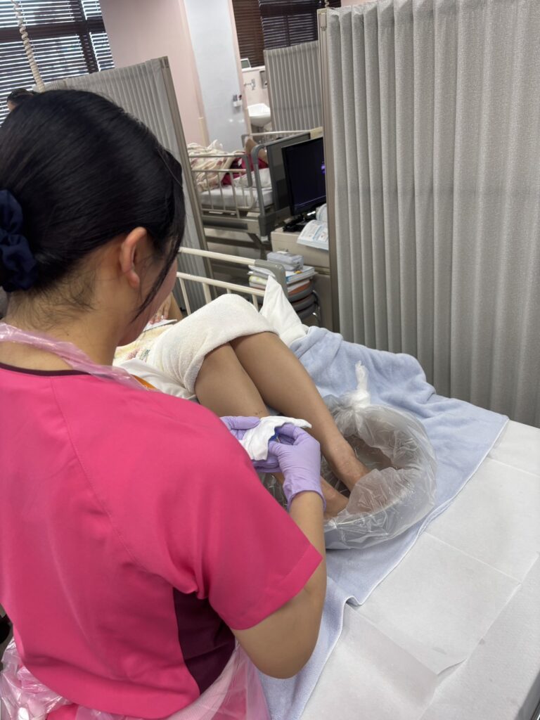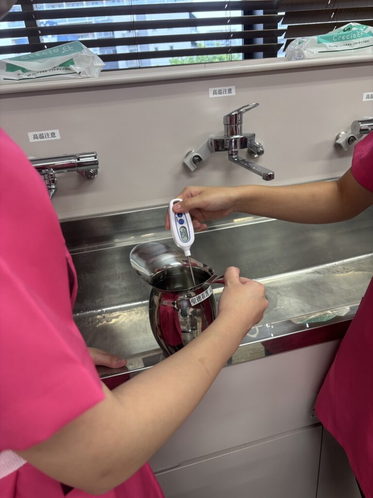 演習前には、事前学習用のワークシートにしっかりと記入し、技術の根拠や手順を確認しています。足浴では、お湯の温度を丁寧に測定し、熱傷などの事故が起こらないよう細心の注意を払いました。また、患者役も体験することで、ケアを受ける側の視点を理解し、互いにフィードバックを行いながら技術力の向上を図りました。