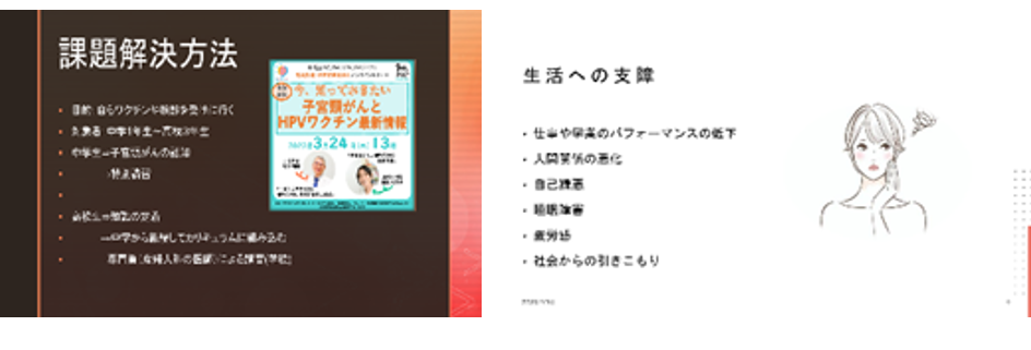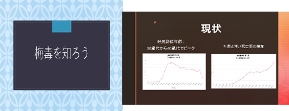 最近、若い人の間で増えている「梅毒」「子宮頸がん」「PMS(月経前症候群)」について、厚生労働省のホームページなどを使って調べます。大学で学んだ知識や、自分たちで調べたことをもとに、それぞれの病気のしくみや症状、治療法について理解を深めます。