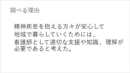 4年生を中心に、世の中で話題・問題になっている精神看護に関すること、時流に沿って自分たちの関心のあることをテーマに、意見を出し合います。