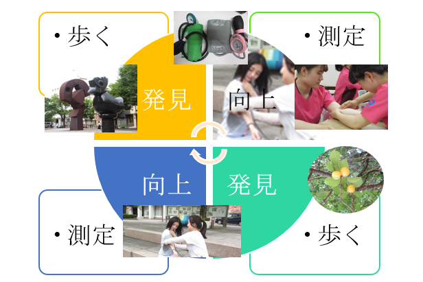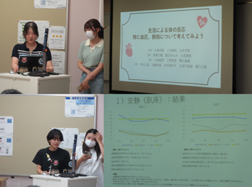 私たちのゼミでは、1年生から4年生までの14人で、心臓や血管のはたらき(循環器)について探究しました。まず、血圧を正しく測る技術を身につけることを目標に、大学構内を歩き、血圧と脈拍を測定しました。3年生と4年生は実習で得た経験を基に、血圧測定のコツを1、2年生に伝授しました。1、2年生も練習を重ねるうちに、動いたあとでも正確に測定できるようになりました。