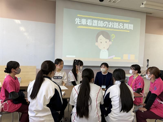 演習後に「先輩看護師のお話&質問」タイムをしました。高校生も在学生も先輩看護師の体験談に目を輝かせ、積極的に質問する姿が印象的でした。