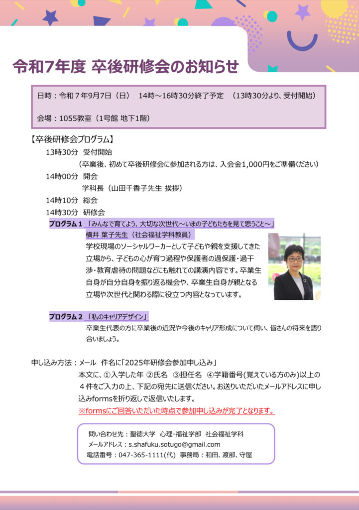 9月7日(日)14:00より、社会福祉学科 卒後研修会を開催いたします🎉